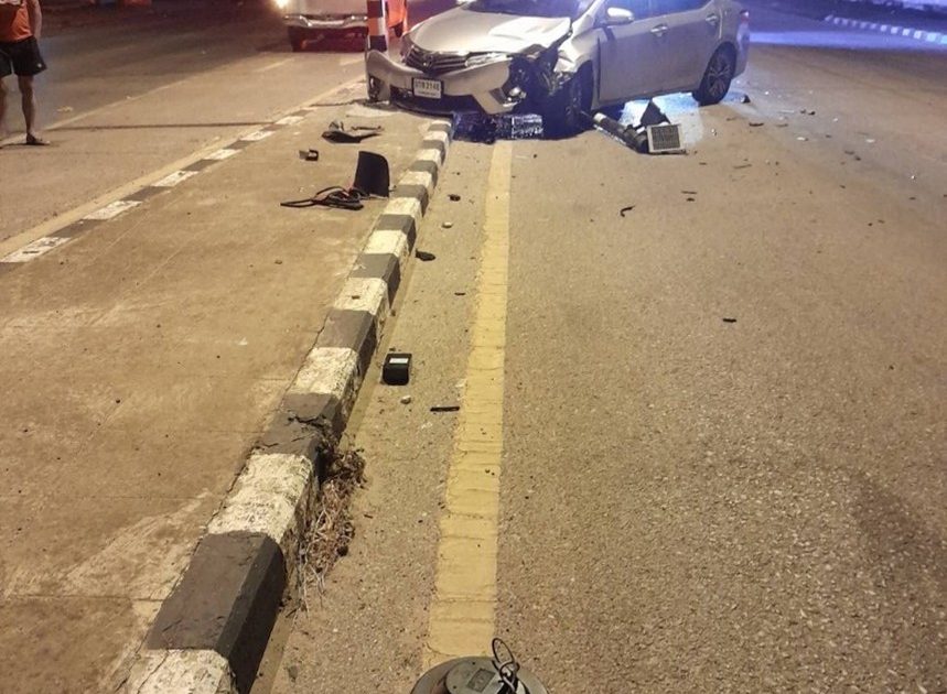 ร.ต.อ.ทินกร ดวงแสงจันทร์ รองสว.(สอบสวน) ร้อยเวร 30 ออกตรวจจุดเกิดเหตุ รถยนต์ชนกับเสาไฟฟ้า บริเวณเกาะกลางถนนหน้าวัดศรีพนา